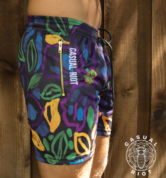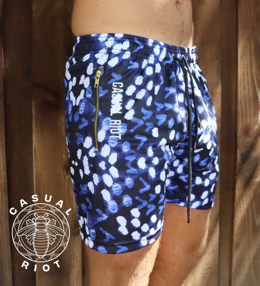 LUXE GOLD SHORTS are made with a 6" inseam, GOLD zipper on both front pockets, and a smooth lightweight poly mesh. These shorts are some of our most versatile, due to the higher gsm of mesh, making them sturdy. Comprised of statement prints, they are the perfect addition to your gym, beach or club fit.
