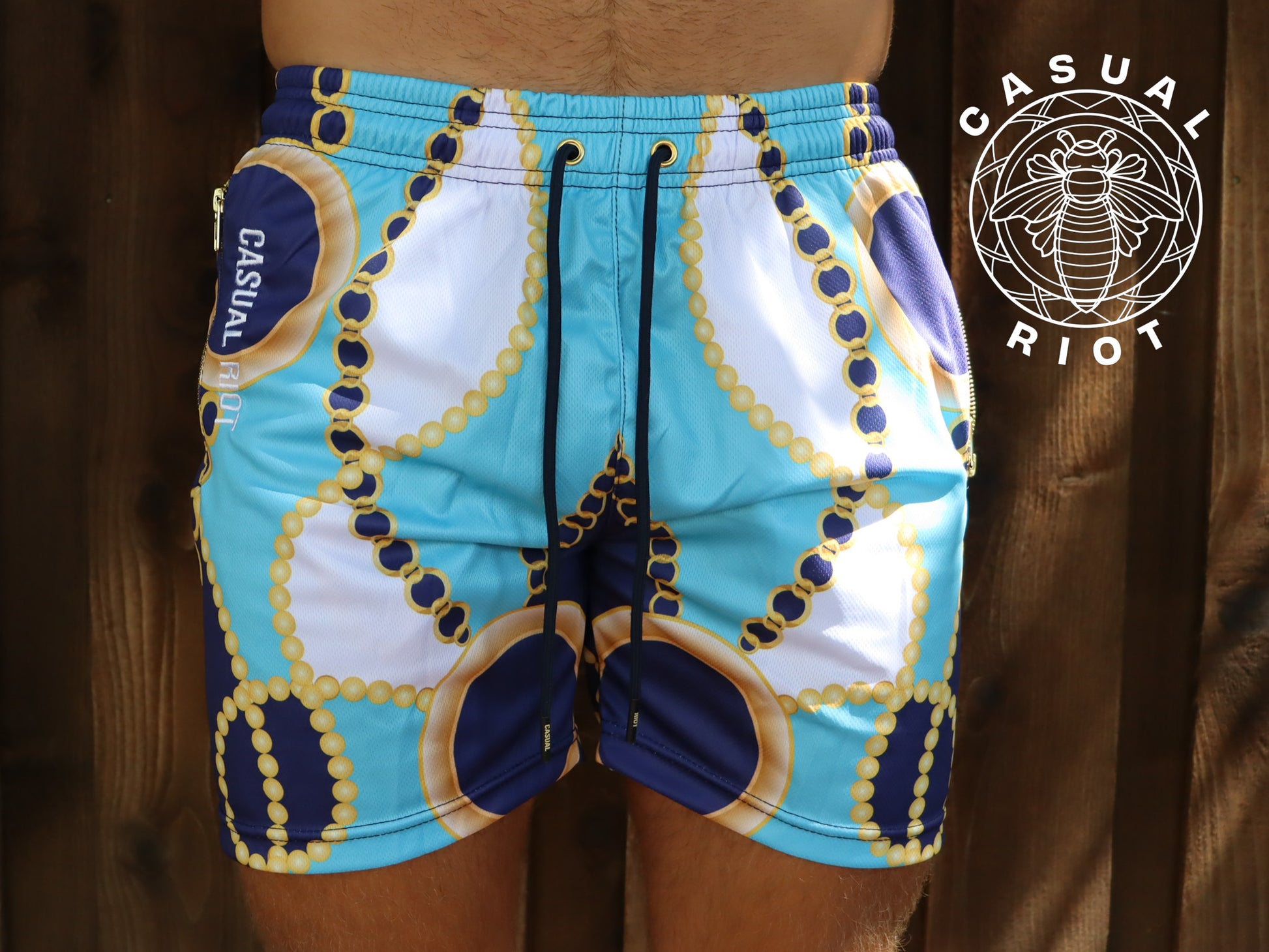 LUXE SHORTS are made with a 6" inseam, GOLD zipper on both front pockets, and a smooth lightweight poly mesh. These shorts are some of our most versatile, due to the higher gsm of mesh, making them sturdy. Comprised of statement prints, they are the perfect addition to your gym, beach or club fit. They now feature a slimmer, more contoured fit.